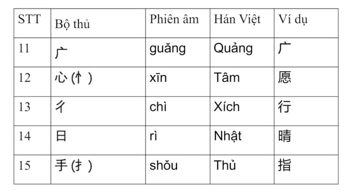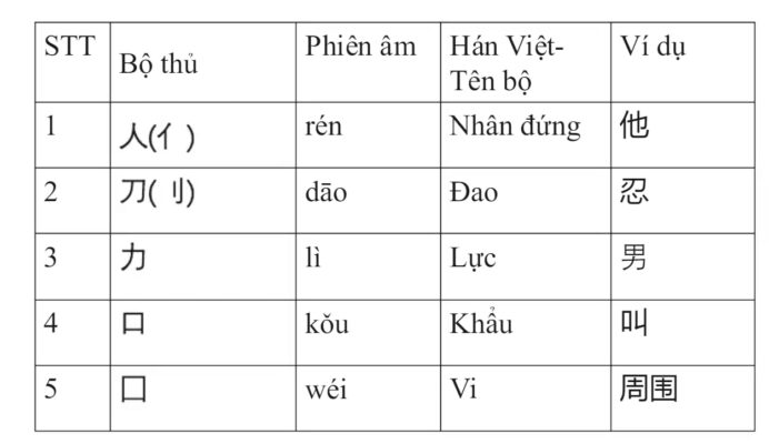 Dưới đây là danh sách một số bộ thủ quan trọng bạn nên ghi nhớ đầu tiên: