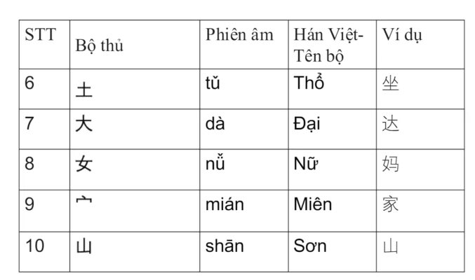 Tên bộ thủ + nghĩa tiếng Việt + ví dụ chữ Hán.