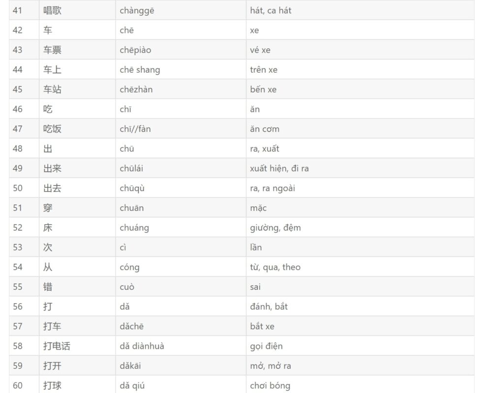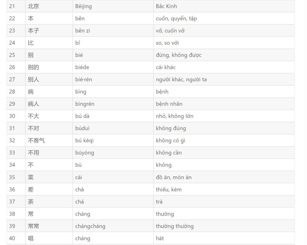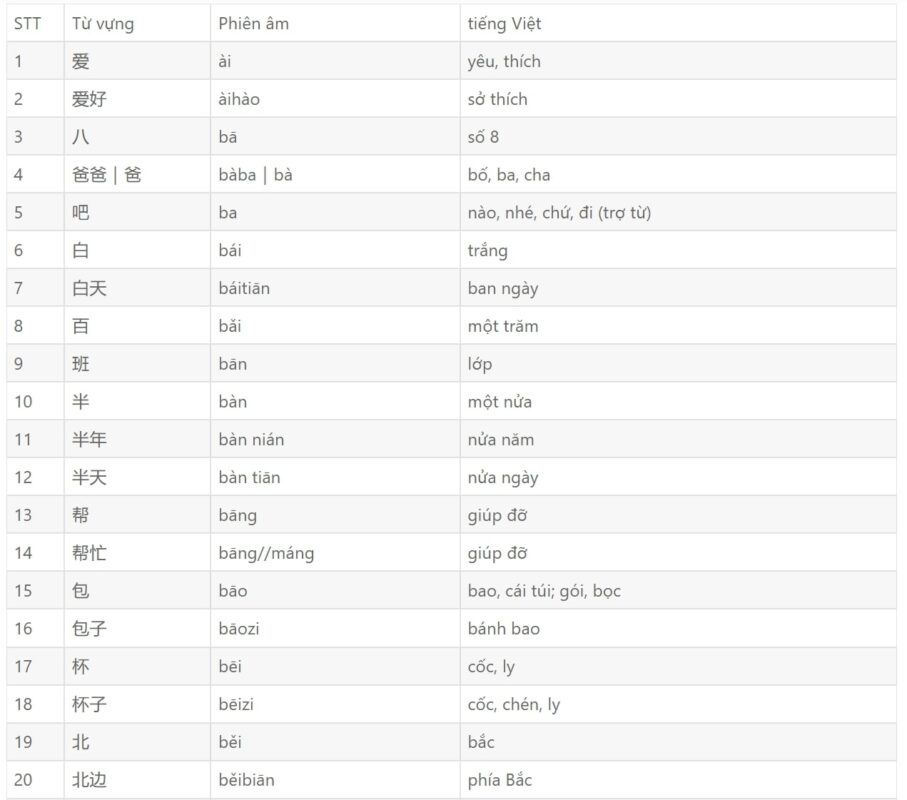 Danh sách 500 từ tiếng Trung HSK 1: Bao gồm từ, Pinyin, nghĩa tiếng Việt, giúp người học dễ hiểu và ghi nhớ theo ngữ âm.