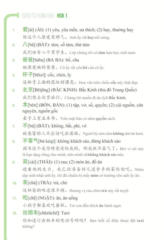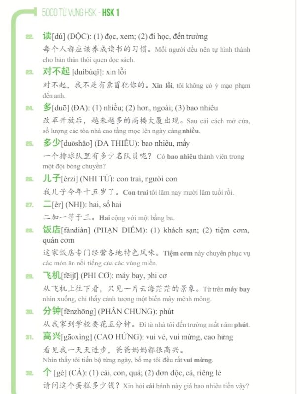 Điểm nổi bật của 5000 Từ Vựng Tiếng Trung là mỗi từ đều kèm phiên âm pinyin, nghĩa tiếng Việt và ví dụ minh họa thực tế, giúp người học ghi nhớ dễ dàng và áp dụng nhanh chóng trong hội thoại hàng ngày. Đây là tài liệu không thể thiếu cho học sinh, sinh viên, người đi làm, hoặc ai đang chuẩn bị thi HSK từ cấp độ 1 đến 6.