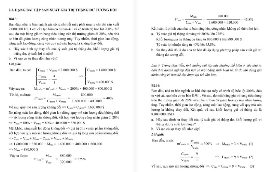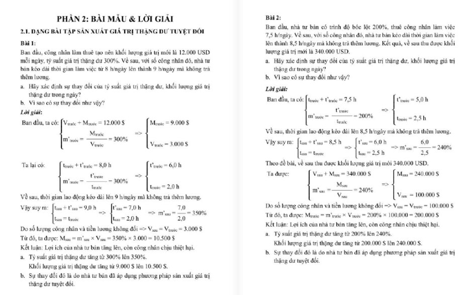 Điều này giúp người học hiểu sâu bản chất bóc lột trong nền sản xuất tư bản chủ nghĩa thay vì chỉ thao tác số học đơn thuần. Phần giải cũng chú trọng liên hệ thực tiễn, đặt bài toán vào bối cảnh vận động của nền kinh tế thị trường để tăng tính ứng dụng. Nhờ vậy, người học có thể củng cố tư duy phân tích thay vì phụ thuộc vào việc ghi nhớ công thức rời rạc. Đây chính là yếu tố tạo nên giá trị học thuật và thực tiễn của bộ tài liệu.
