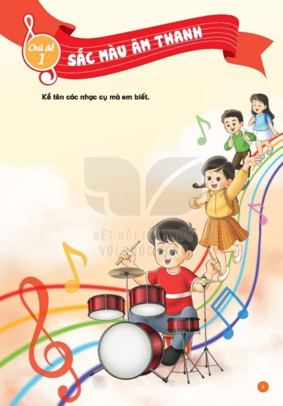 Trẻ được làm quen với các nhạc cụ như trống nhỏ, thanh phách, trống cơm, sáo, đàn tranh. Nội dung minh họa rõ ràng, giúp trẻ dễ dàng nhận diện hình dạng và âm sắc của từng loại nhạc cụ.