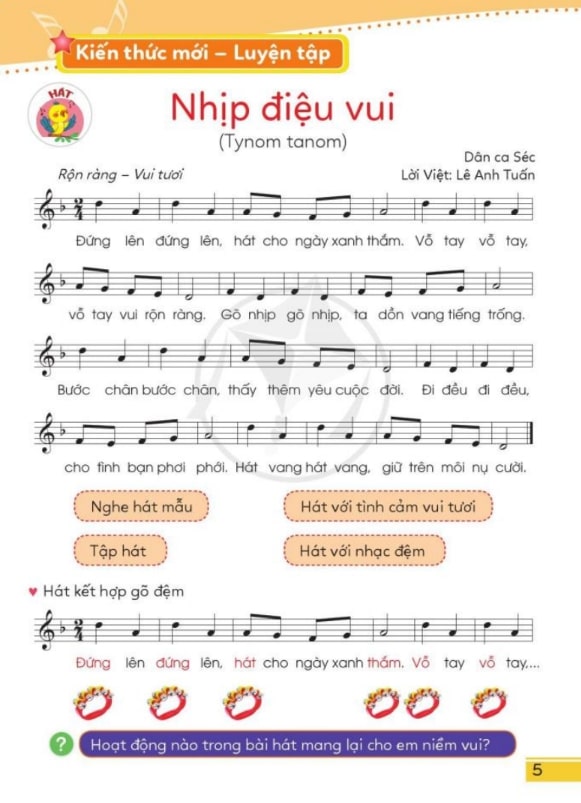 Bài hát và luyện giọng: Học sinh học hát các bài hát phù hợp độ tuổi, kết hợp vận động cơ thể để nâng cao sự phối hợp tay chân và nhịp điệu.