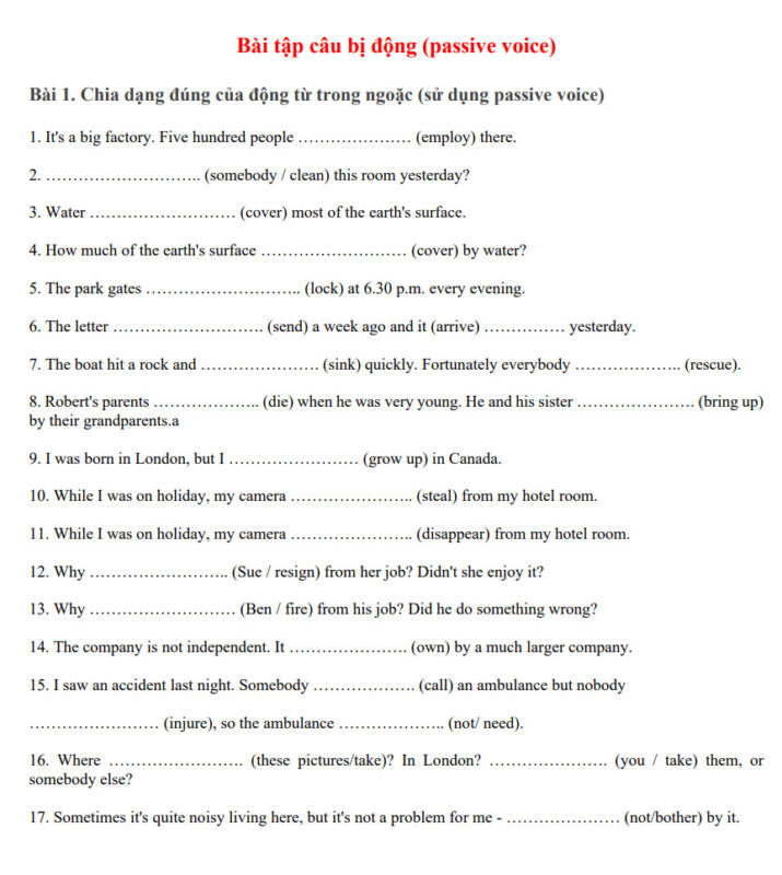 Không dừng lại ở những câu đơn giản, bài tập câu bị động tổng hợp thường bao gồm nhiều dạng khác nhau như câu ở các thì cơ bản, câu có hai tân ngữ, câu bị động với động từ khiếm khuyết và cả những cấu trúc bị động đặc biệt. Dạng bài này giúp người học làm quen với cách sử dụng câu bị động trong nhiều tình huống thực tế.