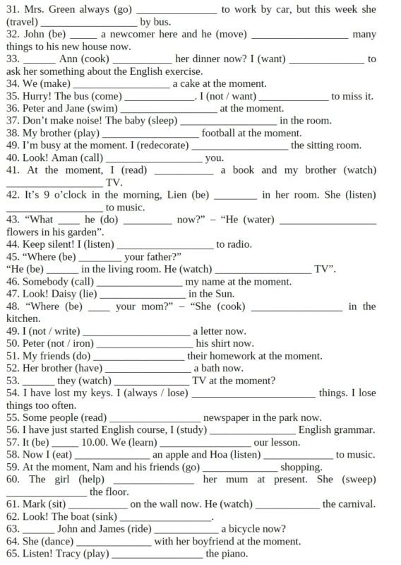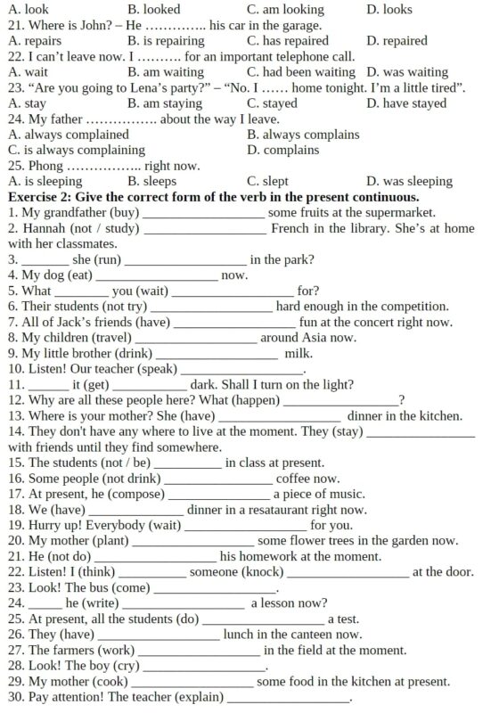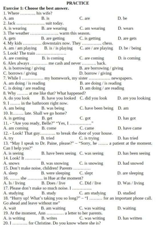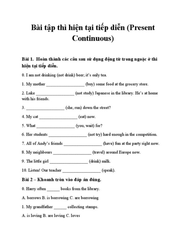 Tài liệu phù hợp cho học sinh, sinh viên và người mới bắt đầu ôn luyện ngữ pháp. Hãy luyện tập thường xuyên với bài tập thì hiện tại tiếp diễn có đáp án chi tiết để nắm vững ngữ pháp và tự tin hơn trong mọi tình huống giao tiếp tiếng Anh.