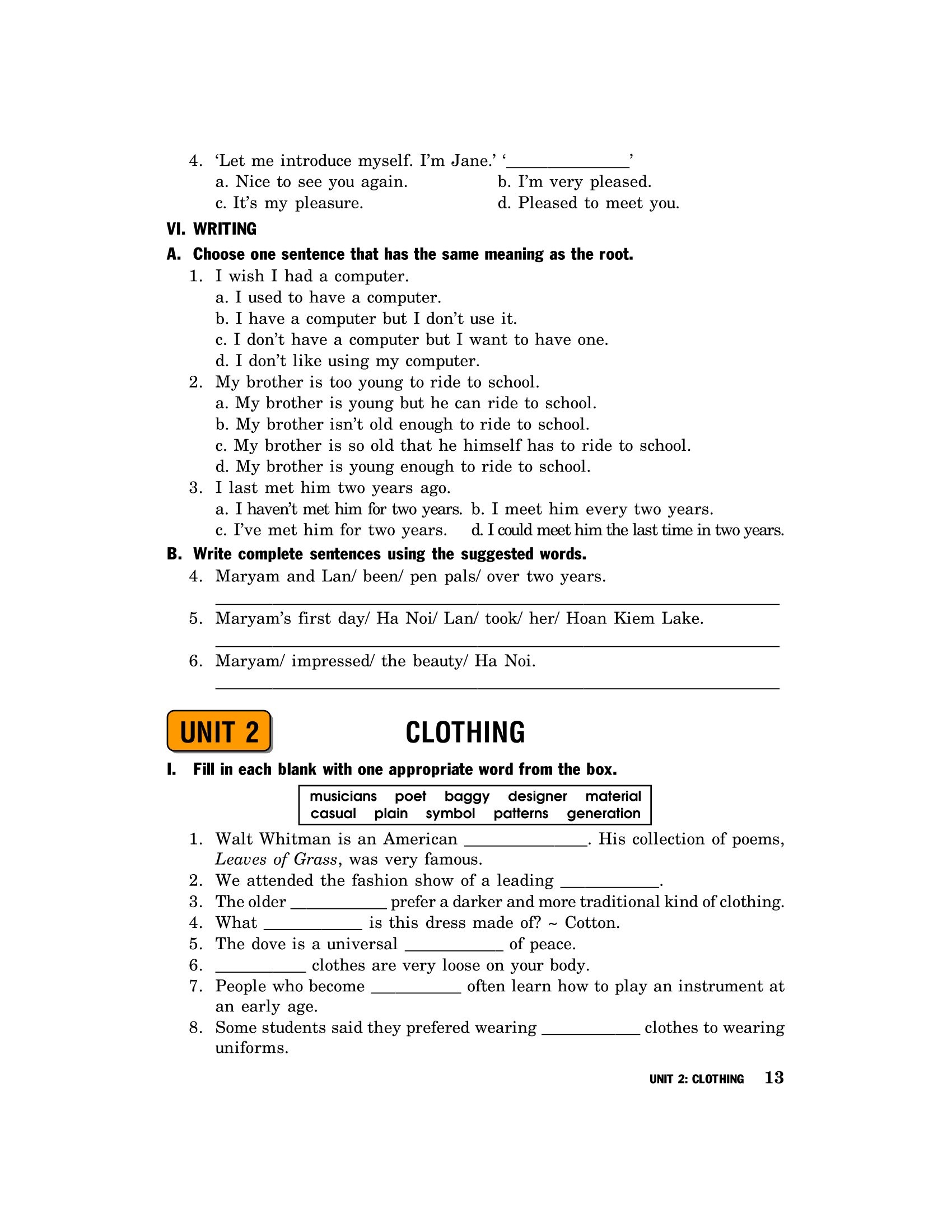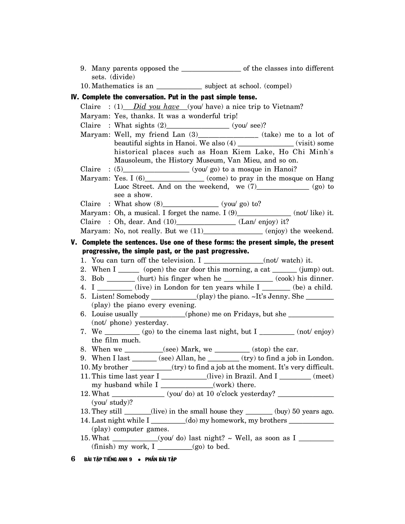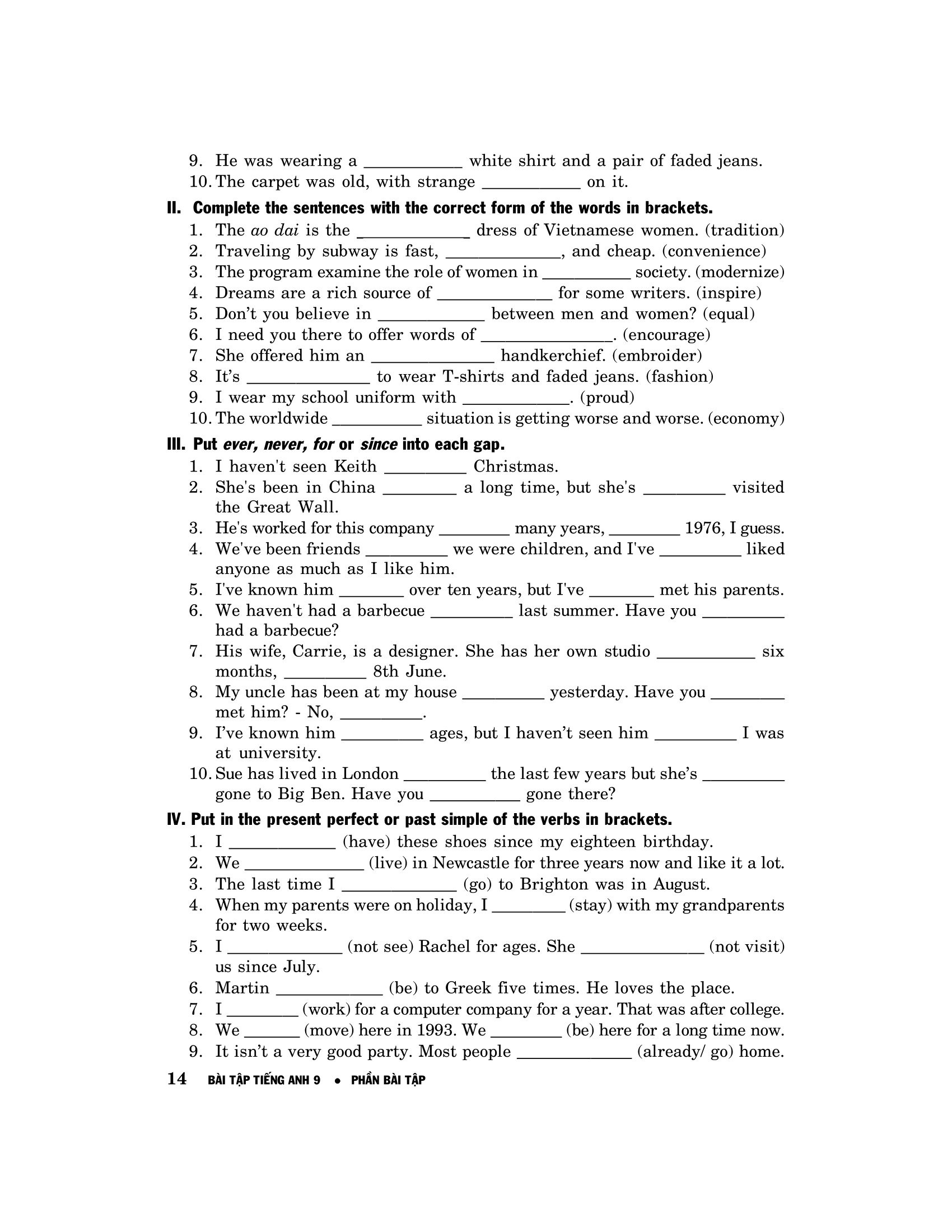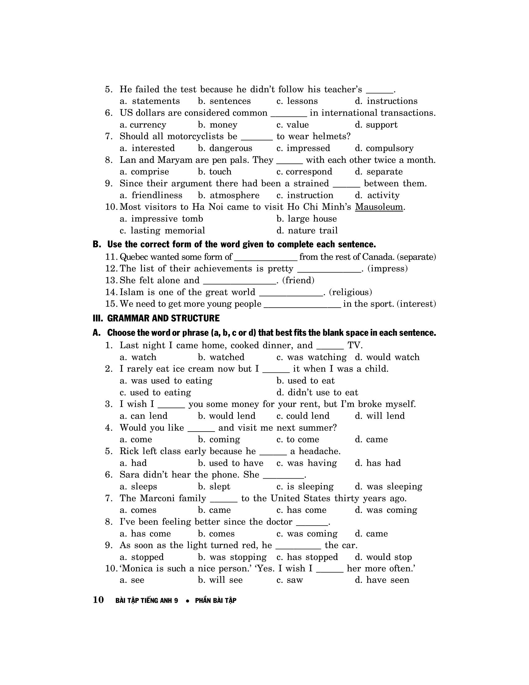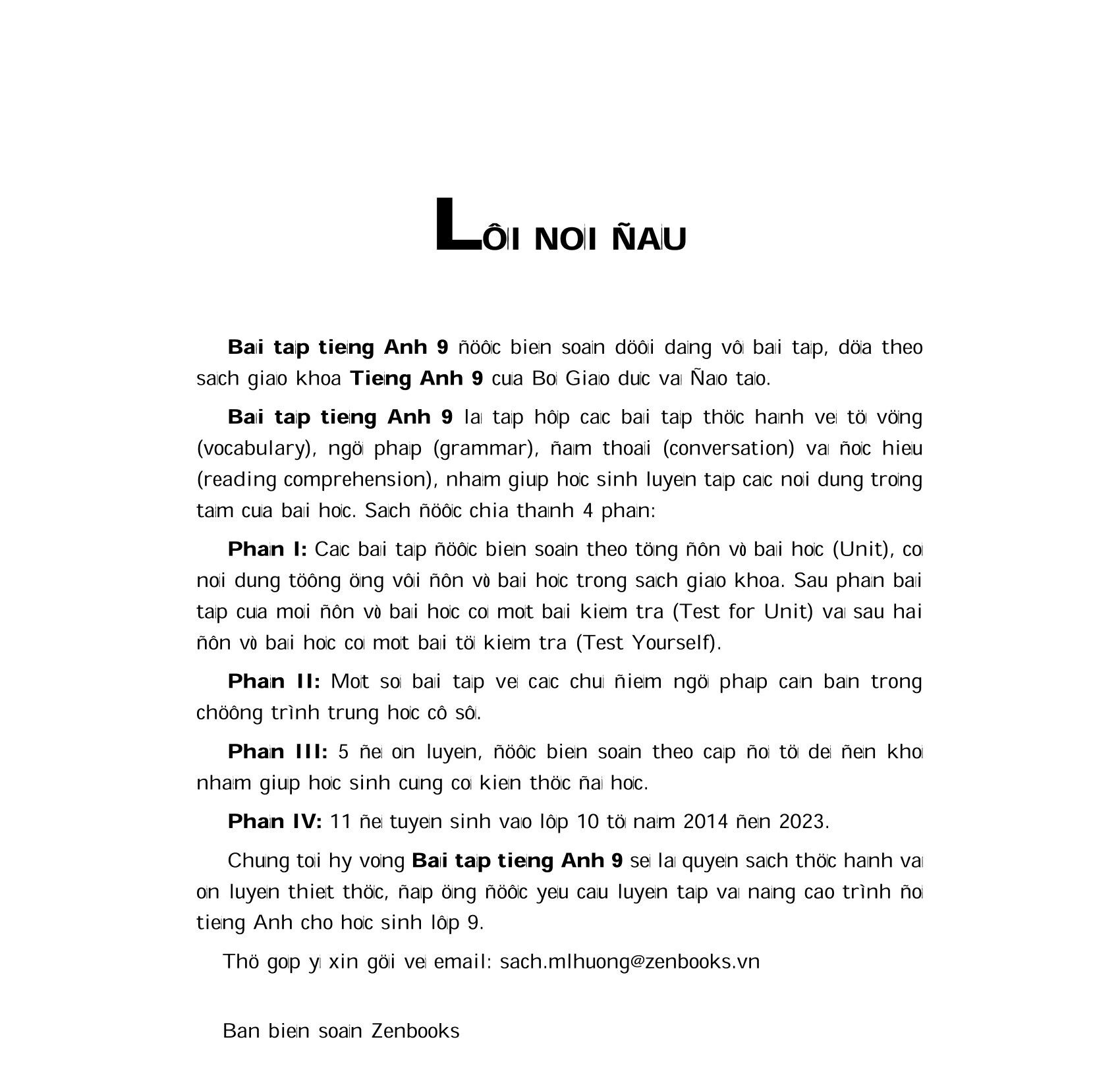 Bài Tập Tiếng Anh 9 là một trong những cuốn tài liệu luyện tập tiếng Anh quan trọng dành cho học sinh lớp 9, được biên soạn dựa trên chương trình chính thống của Bộ Giáo Dục và Đào Tạo. Với sự biên soạn kỹ lưỡng, cuốn sách mang đến hệ thống bài tập toàn diện, bao gồm từ vựng, ngữ pháp, hội thoại và đọc hiểu.
