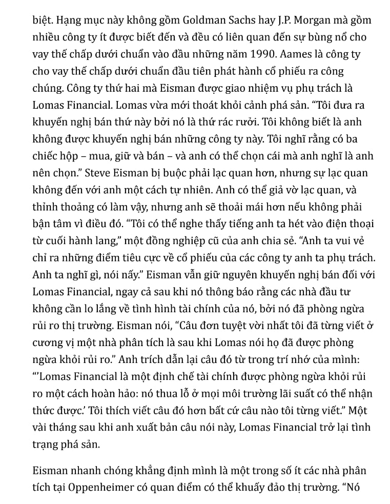 Qua câu chuyện của họ, người đọc hiểu rõ cách thị trường phái sinh, trái phiếu subprime, CDO và CDS vận hành, đồng thời thấy rõ vai trò của các ngân hàng, cơ quan xếp hạng tín nhiệm và nhà quản lý tài chính. Những thuật ngữ phức tạp được giải thích đơn giản, giúp người không chuyên dễ theo dõi.