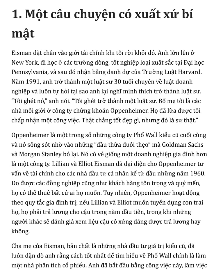 Michael Lewis kết hợp dữ liệu tài chính khô khan với câu chuyện cá nhân sống động, giúp người đọc dễ tiếp nhận. Những nhân vật chính như Michael Burry, Steve Eisman, Greg Lippmann và Cornwall Capital đều được xây dựng chi tiết, tạo nên trải nghiệm đọc vừa giáo dục, vừa giải trí.
