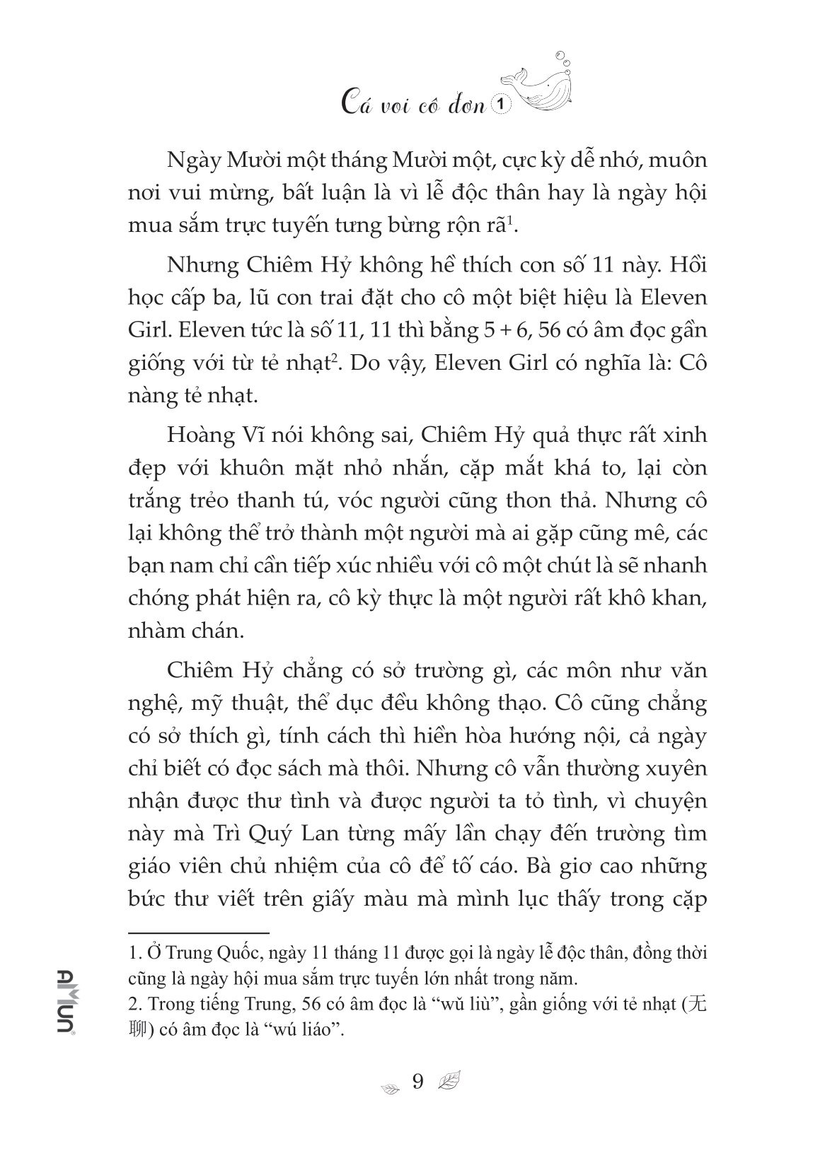 Bộ Cá Voi Cô Đơn – Tập 1 của tác giả Hàm Yên là một tiểu thuyết ngôn tình lôi cuốn, đưa người đọc đến với hành trình giàu cảm xúc của nhân vật chính – cô gái có biệt danh Eleven Girl. Với khát khao tìm kiếm “Mr. Funny” – hình mẫu lý tưởng trong mơ, cô luôn hy vọng tìm thấy một tình yêu trọn vẹn.