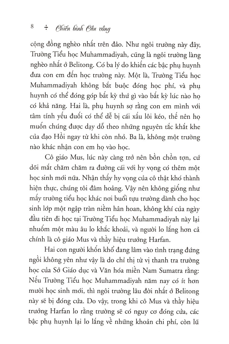 Chiến Binh Cầu Vồng của tác giả Andrea Hirata là một trong những tác phẩm văn học có sức ảnh hưởng lớn nhất tại Indonesia, được độc giả trong và ngoài nước yêu thích. Cuốn sách kể lại câu chuyện cảm động về những học sinh nghèo tại ngôi trường Hồi giáo Muhammadiyah cùng những người thầy tận tâm. Họ phải đối diện với vô vàn thử thách: nguy cơ đóng cửa trường học, sự khắc nghiệt của thiên nhiên, những chuyến phiêu lưu đầy hiểm nguy và cả sự cám dỗ từ đồng tiền kiếm được nhờ lao động cực nhọc. Dù vậy, niềm đam mê học tập, tình bạn trong sáng và khát vọng vươn lên đã giúp họ trở thành những “chiến binh cầu vồng” kiên cường, truyền cảm hứng mạnh mẽ cho hàng triệu độc giả trên thế giới.