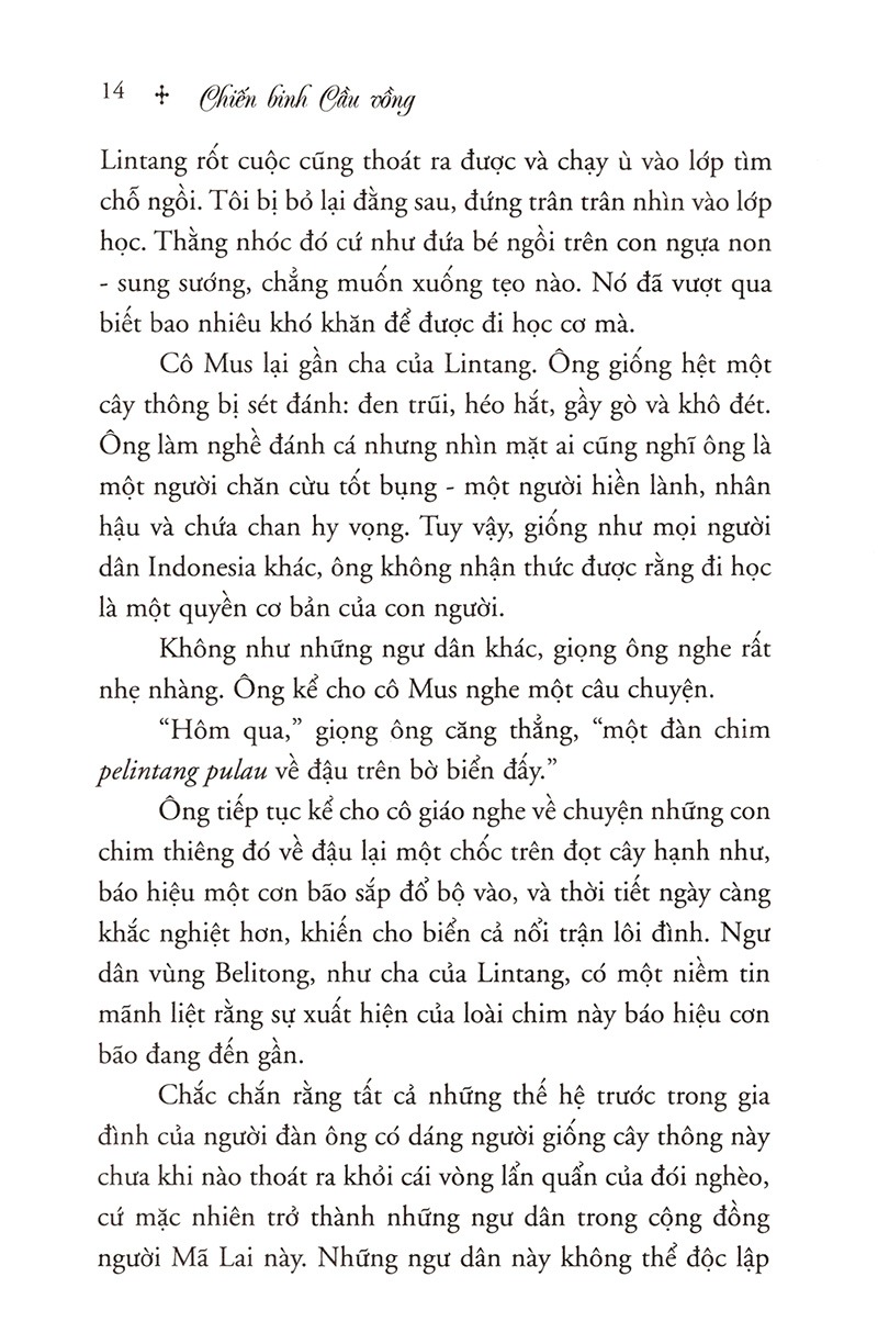 Chiến Binh Cầu Vồng của nhà văn Andrea Hirata là kiệt tác văn học nổi tiếng nhất Indonesia, tái hiện hành trình xúc động của những đứa trẻ nghèo hiếu học cùng người thầy tận tâm. Tác phẩm không chỉ mở ra một chuyến phiêu lưu thấm đẫm tình người, mà còn truyền tải những giá trị sâu sắc về nghị lực, niềm tin và khát vọng vươn lên. Mỗi trang sách là sự hòa quyện giữa tình bạn chân thành, tình yêu thương cao đẹp và bài học quý giá về kỷ luật, lòng nhân ái. Chiến Binh Cầu Vồng không chỉ phản ánh rõ nét khoảng cách giàu nghèo trong xã hội, mà còn lay động trái tim người đọc, khơi dậy niềm trân trọng đối với tri thức và khát vọng sống tốt đẹp. Đây chắc chắn là cuốn sách bạn không thể bỏ lỡ.