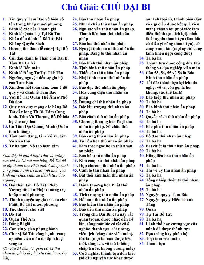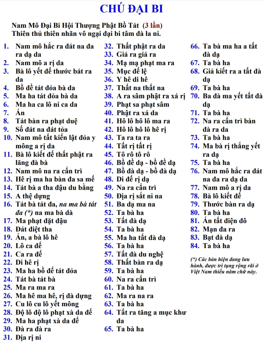 Chú Đại Bi tiếng Việt 84 câu PDF: Đây là phiên bản chuẩn, dễ đọc, có đánh số từng câu giúp người tụng dễ theo dõi. Phiên bản PDF giúp bạn có thể đọc offline trên điện thoại, máy tính hoặc in ra để sử dụng hàng ngày.
