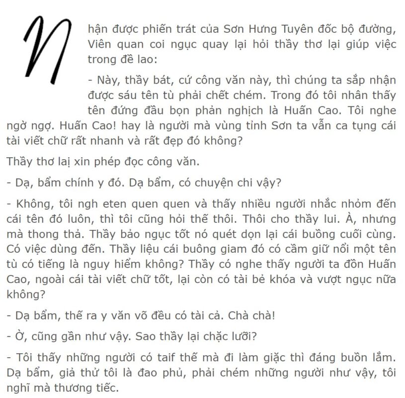 Cảnh cho chữ trong ngục tối được xem là đoạn văn nổi tiếng nhất của tác phẩm, nơi nghệ thuật đạt tới đỉnh cao biểu tượng. Không gian tăm tối, ẩm thấp của nhà tù bỗng bừng sáng bởi bó đuốc, tấm lụa trắng và những nét chữ vuông vức.