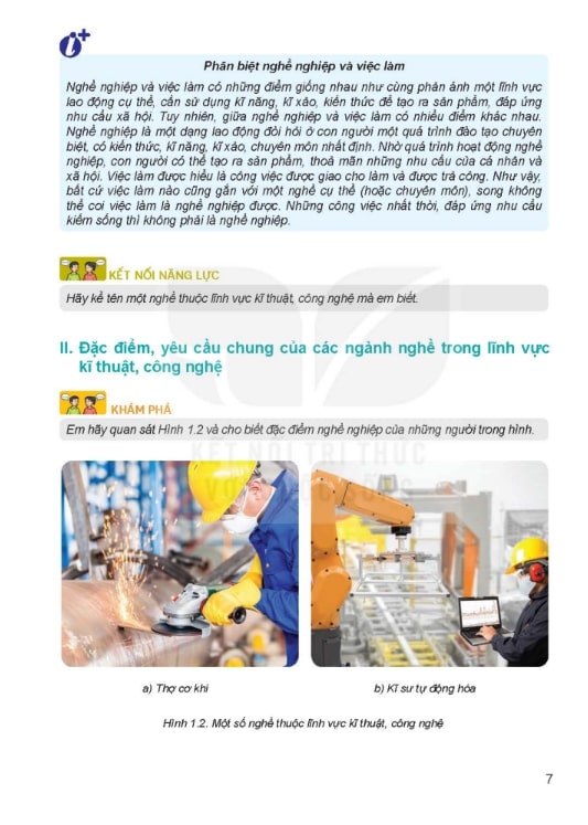 Trong Công nghệ 9 Kết nối tri thức Định hướng nghề nghiệp Bài 2, học sinh được giới thiệu về các ngành nghề phổ biến hiện nay, bao gồm công nghệ thông tin, kỹ thuật, kinh tế, dịch vụ, nghệ thuật và sáng tạo. Đồng thời, học sinh học cách nhận định các xu hướng nghề nghiệp, từ đó chọn lựa ngành phù hợp. -