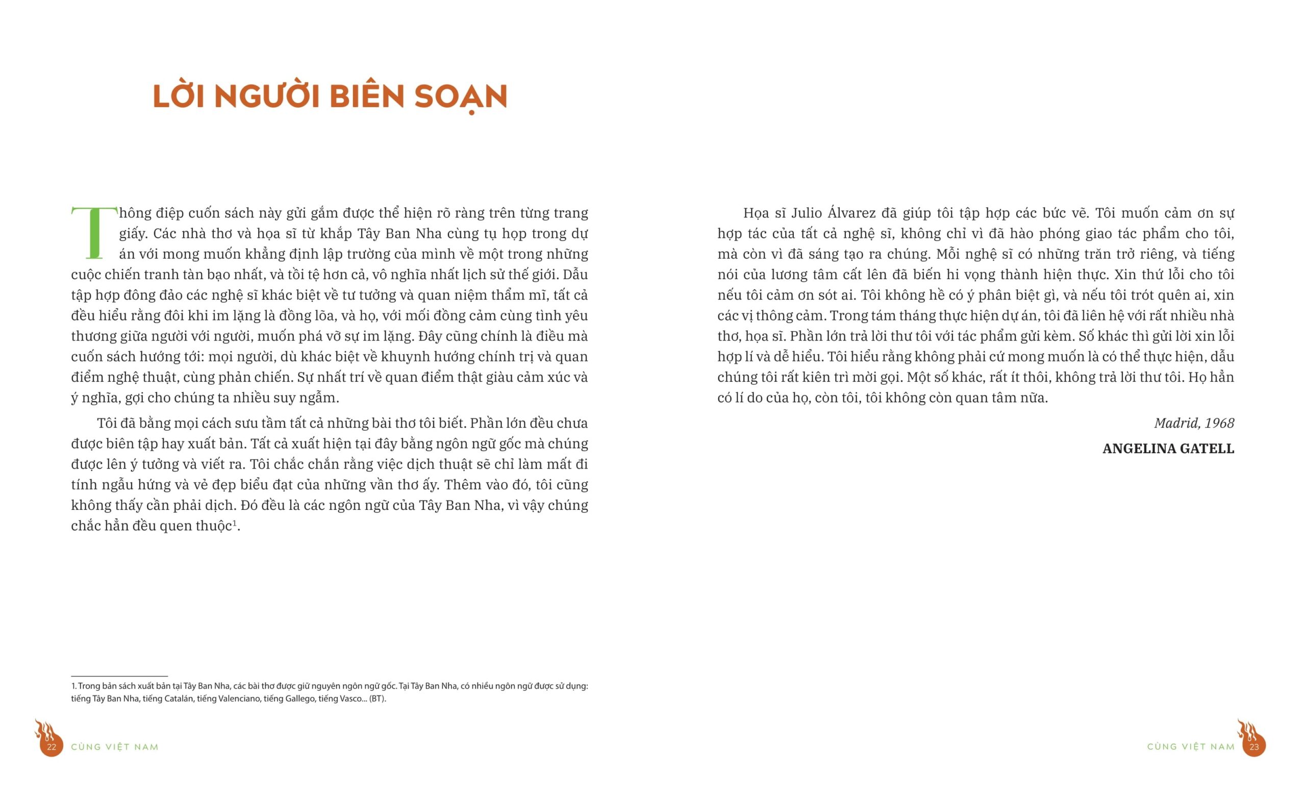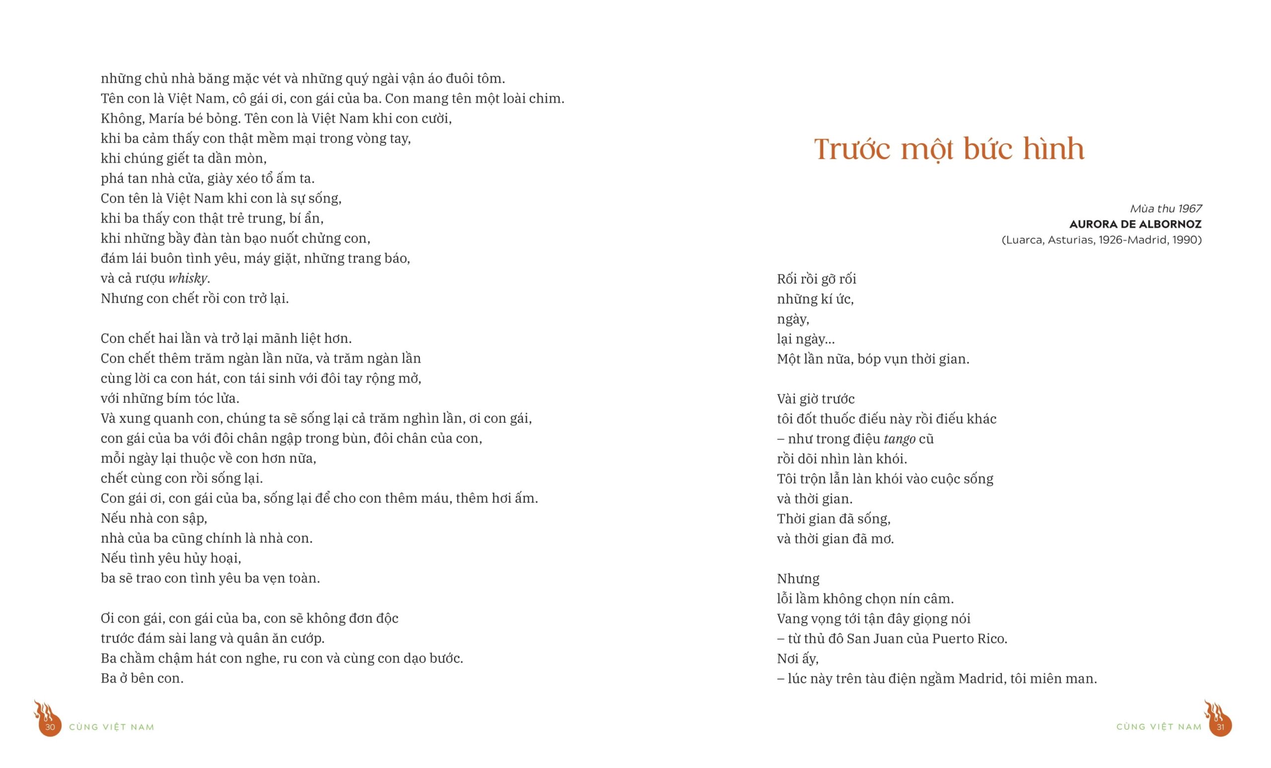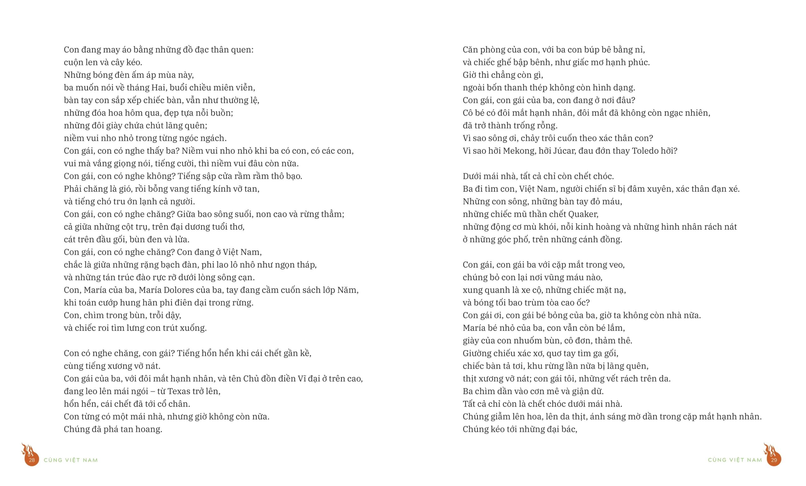 Khi bước vào thế giới của Cùng Việt Nam, độc giả sẽ bắt gặp những vần thơ lay động lòng người, gửi gắm thông điệp mạnh mẽ về hòa bình, công lý và tình yêu thương. Đây cũng chính là tiếng nói chân thành của giới trí thức và thi sĩ Tây Ban Nha, dành trọn trái tim để ủng hộ, sẻ chia cùng dân tộc Việt Nam trong những ngày tháng gian khó nhất.