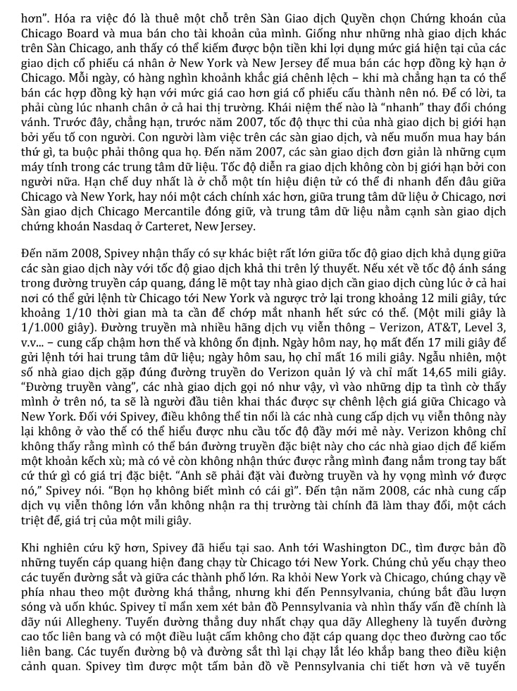 Giao dịch cao tần là chủ đề trung tâm của cuốn sách. Michael Lewis mô tả chi tiết cách thức hoạt động của HFT: các công ty sử dụng cáp quang tối ưu, máy chủ siêu tốc và thuật toán phức tạp để đặt và hủy lệnh chỉ trong nano giây. Tốc độ vượt trội này giúp họ luôn đi trước thị trường và tận dụng thông tin trước khi nhà đầu tư khác kịp phản ứng.