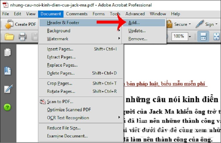 Trên menu, chọn “Document” (Tài liệu) → “Header & Footer” (Đầu & Chân trang) → “Add” (Thêm).