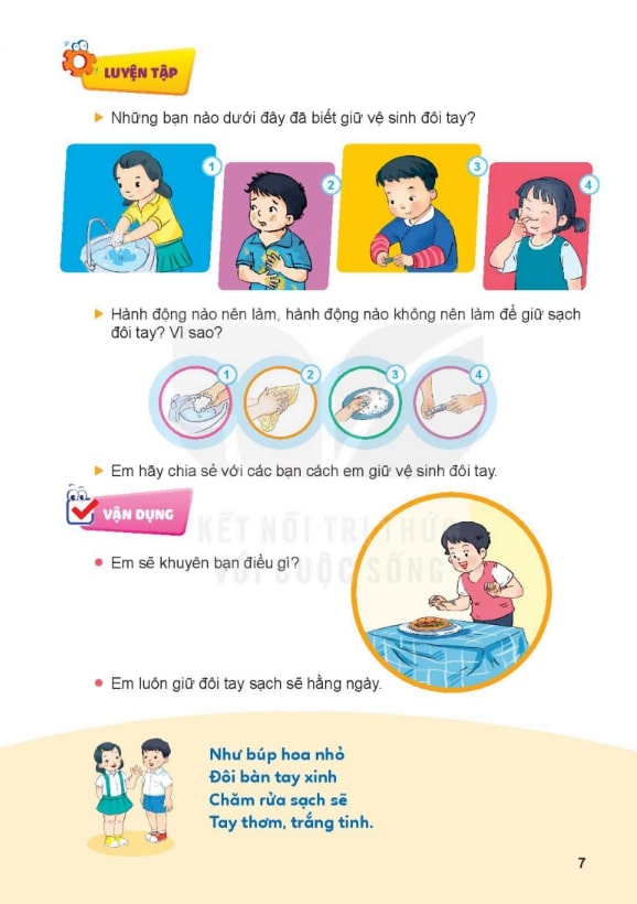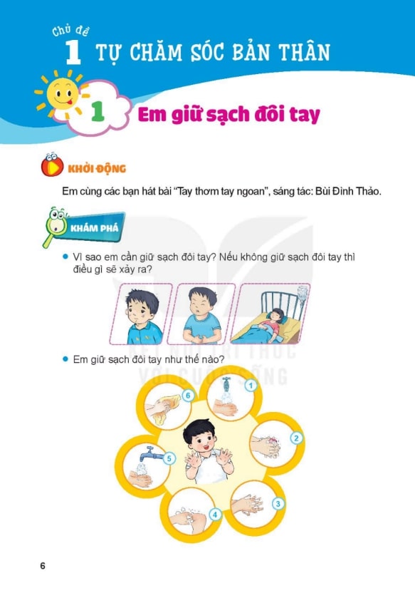 Vệ sinh, bảo vệ môi trường và sức khỏe: Bài học nhấn mạnh thói quen giữ gìn vệ sinh cá nhân, bảo vệ môi trường và duy trì lối sống lành mạnh. Ví dụ, trẻ học cách rửa tay trước khi ăn, vứt rác đúng nơi quy định hoặc trồng cây xanh trong lớp học.