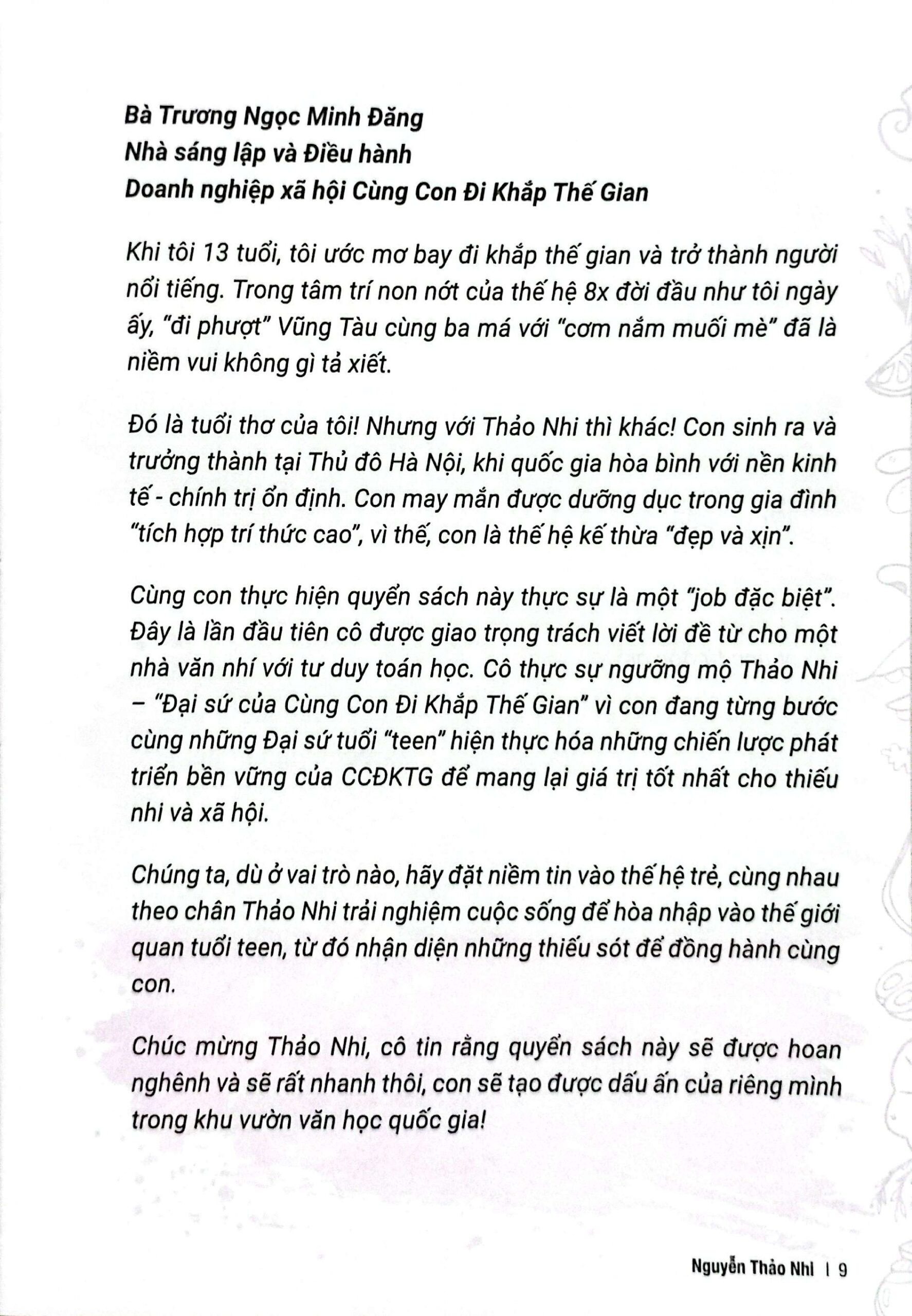 “Dạo Khắp Một Vòng Việt Nam” nghe như một lời mời gọi thú vị, đầy lôi cuốn. Với tôi – một người mê xê dịch, chia sẻ cảm nhận qua mạng xã hội là điều quen thuộc, nhưng việc Thảo Nhi chọn xuất bản sách ở tuổi 13 lại là bước đi đột phá. Hà Nội, Đà Nẵng hay TP.HCM dưới góc nhìn tuổi teen được tái hiện bằng những “công thức toán học” dễ thương và mới mẻ. Hơn cả một cuốn sách, đây còn là minh chứng cho sự đầu tư vào tri thức, nhân cách và tấm lòng hướng thiện. Tôi tin độc giả sẽ dành nhiều tình cảm cho tác phẩm này.
