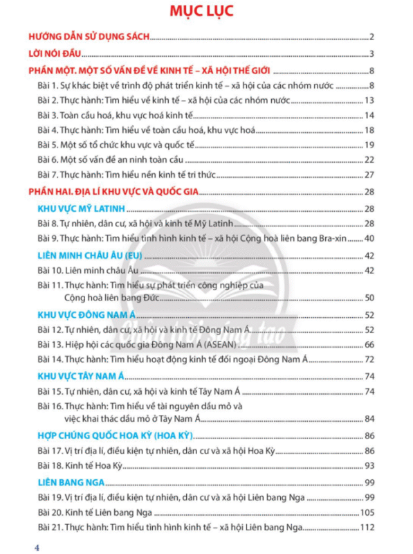 Tập trung vào đặc điểm tự nhiên, dân cư và kinh tế của các khu vực lớn như Đông Á, Đông Nam Á, châu Âu, Hoa Kỳ, Nga, hay Nhật Bản. Học sinh sẽ hiểu được vì sao mỗi khu vực có đặc trưng phát triển khác nhau, và học cách nhìn nhận địa lý trong mối quan hệ toàn cầu.