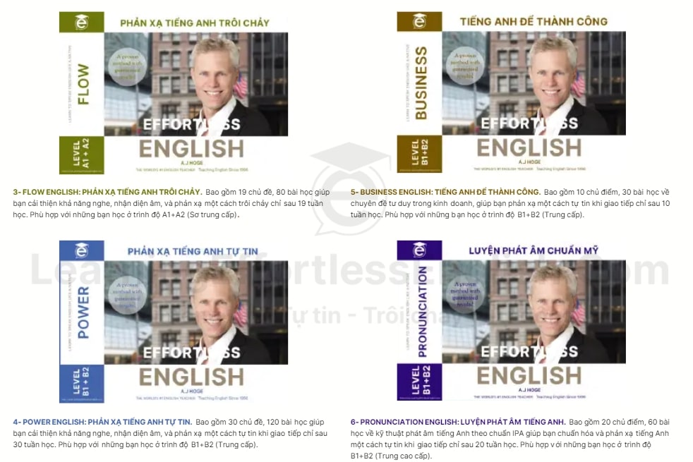 Bộ tài liệu Effortless English Full bao gồm 8 cấp độ từ cơ bản đến nâng cao, được thiết kế bài bản theo lộ trình học tự nhiên: