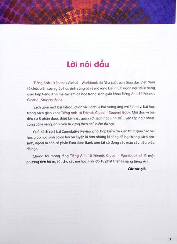 Nhiều học sinh và giáo viên đánh giá rằng Tiếng Anh 10 Friends Global – Workbook không chỉ là một cuốn sách bài tập thông thường, mà còn là “người bạn đồng hành” trong suốt quá trình học tiếng Anh ở bậc THPT. Việc kết hợp giữa lý thuyết, bài tập và ứng dụng thực tiễn khiến cuốn sách trở thành công cụ hỗ trợ toàn diện, giúp học sinh học chắc, nhớ lâu và có thể áp dụng kiến thức ngay vào bài kiểm tra cũng như giao tiếp hàng ngày.