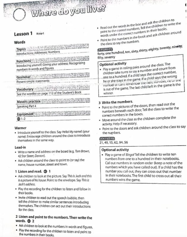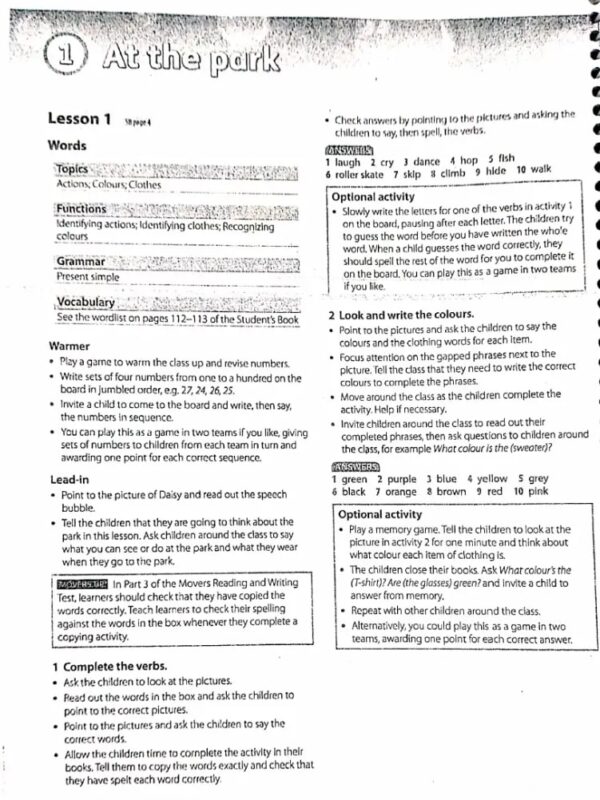 Mỗi bài học trong Get Ready for Movers Teacher’s Book được chia thành những mục nhỏ, giúp giáo viên nắm bắt nhanh cấu trúc: Mục tiêu bài học – Hoạt động khởi động – Hướng dẫn luyện tập – Đánh giá kết quả. Cách trình bày này không chỉ tiết kiệm thời gian soạn giáo án mà còn giúp giáo viên linh hoạt điều chỉnh tùy theo năng lực lớp học.