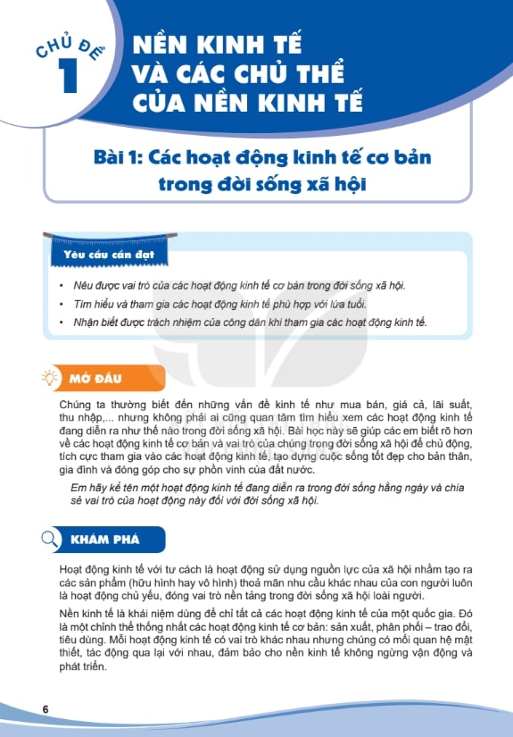 Khái niệm kinh tế học: Giải thích các vấn đề về sản xuất, phân phối, tiêu dùng và quản lý nguồn lực. Học sinh được hướng dẫn nhận biết cách các nguồn lực được sử dụng hợp lý để phục vụ nhu cầu xã hội.
