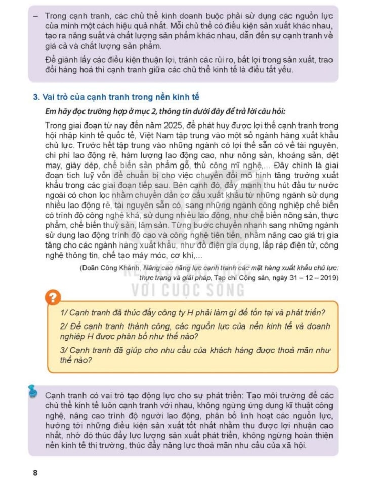 Cuốn sách còn lồng ghép nhiều tình huống thực tế, ví dụ về doanh nghiệp trẻ khởi nghiệp, hay cách người dân địa phương tổ chức sản xuất hàng hóa sạch. Thông qua đó, Kinh tế pháp luật 11 Kết nối tri thức Bài 2 giúp học sinh hình thành tư duy kinh tế sáng tạo, biết tôn trọng quy luật thị trường và phát triển bền vững.