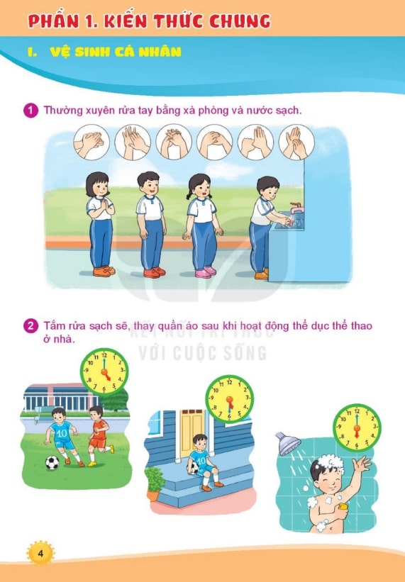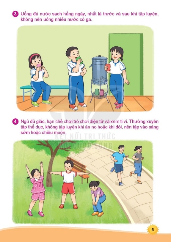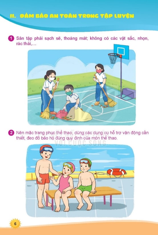 Ngoài hướng dẫn tập luyện, sách còn mở rộng thành các tình huống gắn với đời sống: tư thế đúng khi đeo cặp, quy tắc an toàn khi chơi thể thao, lợi ích của hoạt động ngoài trời,… giúp học sinh hình thành ý thức tự bảo vệ bản thân.
