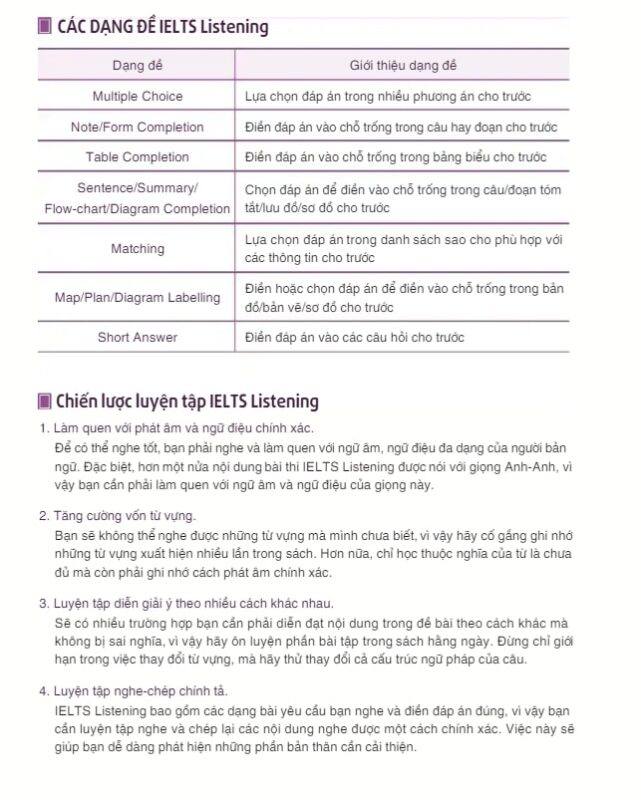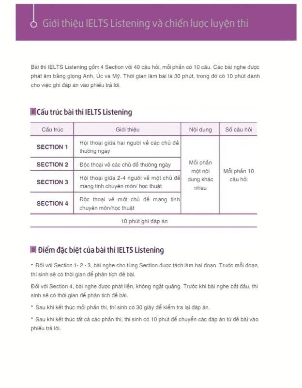 Sách được chia thành 4 phần chính tương ứng với 4 dạng bài trong kỳ thi IELTS Listening: