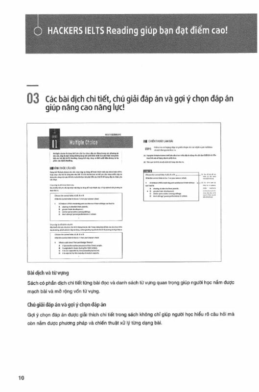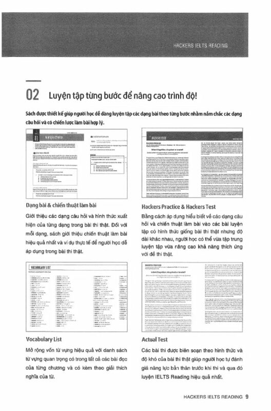 Với bộ đề luyện tập sát với format đề thi thực tế, cùng hướng dẫn giải chi tiết từng bài, Hacker IELTS Reading giúp cải thiện từ vựng, khả năng nhận diện ý chính và hiểu sâu văn bản. Đây là tài liệu không thể thiếu cho học viên muốn tự tin đạt band điểm cao trong IELTS Reading. Ngoài ra, sách còn giúp rèn luyện tư duy phản xạ nhanh khi làm bài và xây dựng kỹ năng đọc linh hoạt, phù hợp cho mọi trình độ từ cơ bản đến nâng cao.