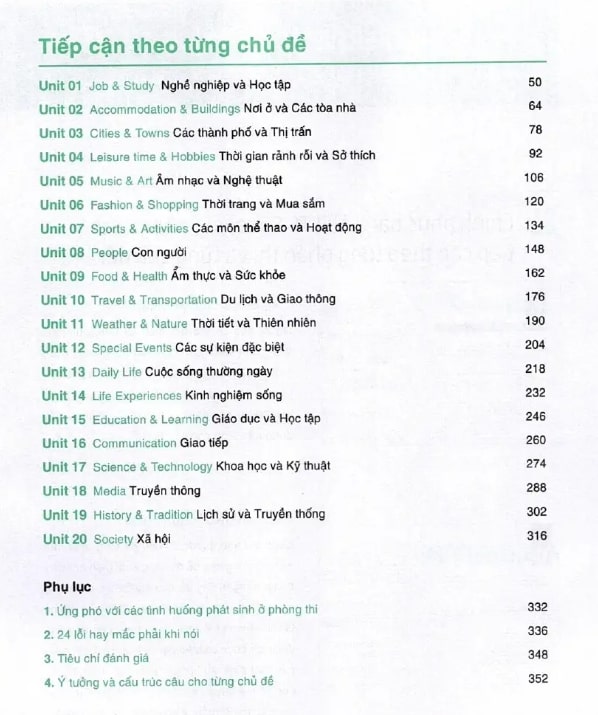Từ những chủ đề quen thuộc như Hometown, Study, Work, Hobbies, Travel, cho đến các chủ đề khó hơn như Technology, Environment, Society, Culture – tất cả đều được cập nhật đúng xu hướng đề thi thật. Bộ sách còn bổ sung từ vựng mở rộng theo từng chủ đề, giúp bạn có “vốn từ linh hoạt” để ứng biến trong mọi tình huống khi thi nói.