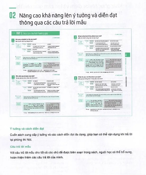 Mỗi phần đều có phần Sample Answer, Từ vựng gợi ý, Collocation, Tips mở rộng ý và Cấu trúc câu thông dụng, giúp người học không chỉ nói đúng mà còn nói hay, nói tự nhiên.