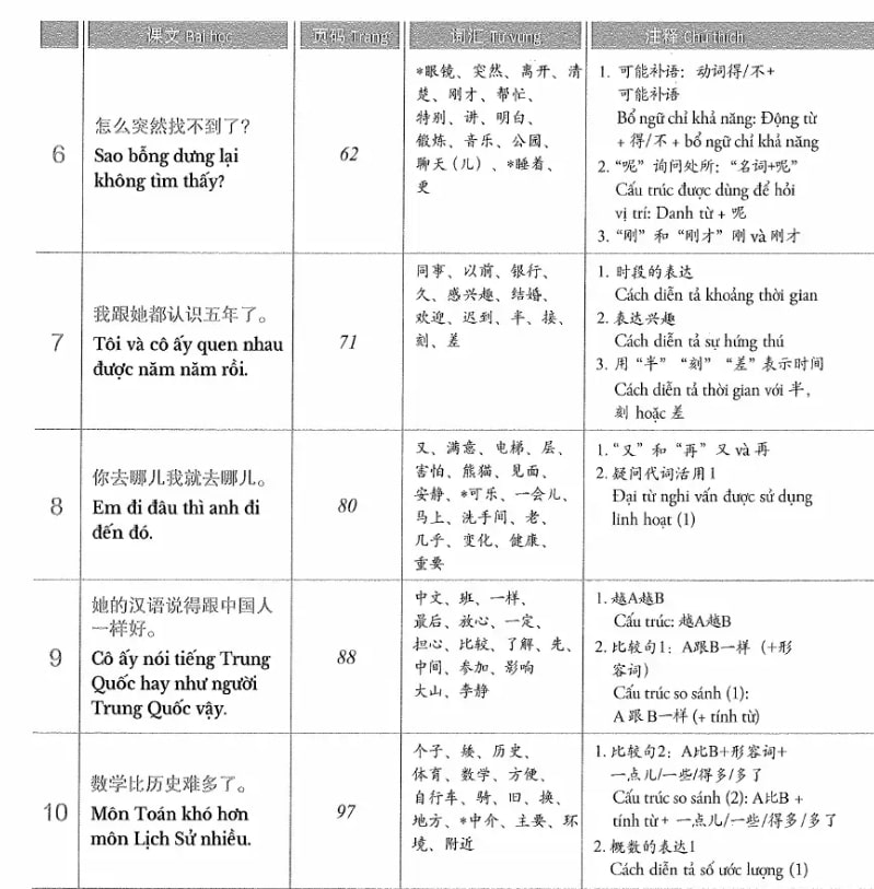 | 1 | Gặp gỡ, giới thiệu bản thân | Ngữ pháp “比”, “更”, “越来越” |