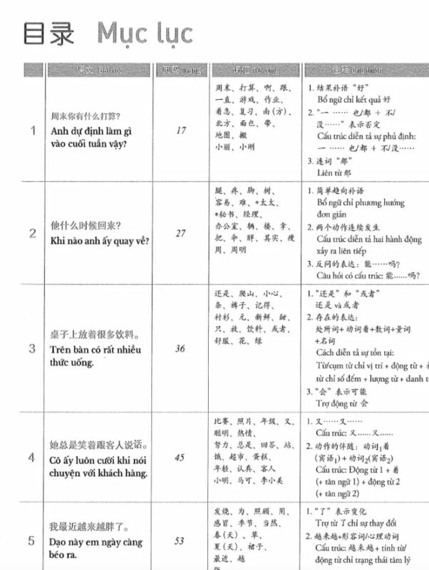 Sách giáo khoa (教材): Gồm 20 bài học, mỗi bài tích hợp phần từ vựng, hội thoại, ngữ pháp và bài luyện tập thực hành.