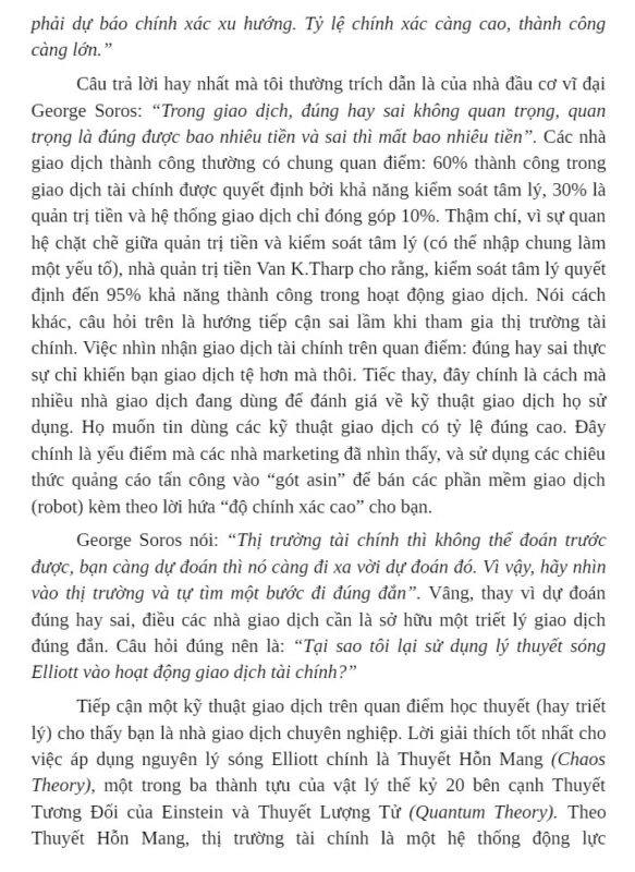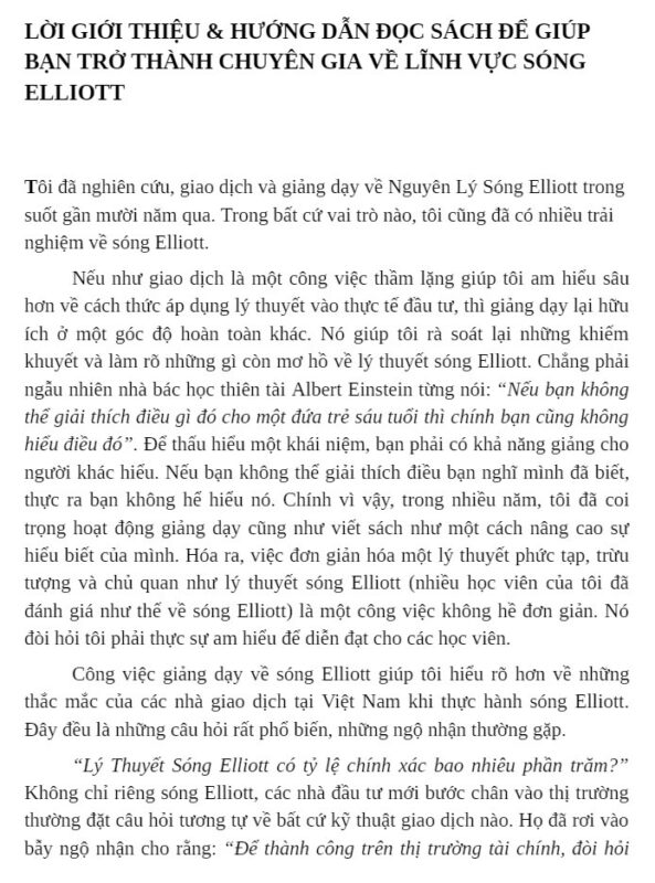 Hướng Dẫn Giao Dịch Theo Sóng Elliott là cẩm nang đầu tư giúp người đọc thấu hiểu nhịp điệu lên xuống của thị trường tài chính một cách khoa học và logic. Sách dẫn dắt từ nguyên lý hình thành sóng, cấu trúc xu hướng cho đến cách nhận diện điểm mua bán có xác suất cao. Thông qua các ví dụ biểu đồ thực tế, nhà đầu tư dễ dàng luyện kỹ năng phân tích và ra quyết định chính xác hơn. Nội dung còn kết hợp chiến lược quản lý vốn nhằm hạn chế rủi ro khi thị trường biến động mạnh. Văn phong mạch lạc, gần gũi nhưng vẫn chuyên sâu, phù hợp cho cả người mới bắt đầu lẫn trader lâu năm. Đây là lựa chọn lý tưởng để xây dựng tư duy giao dịch kỷ luật và bền vững theo phương pháp Sóng Elliott.
