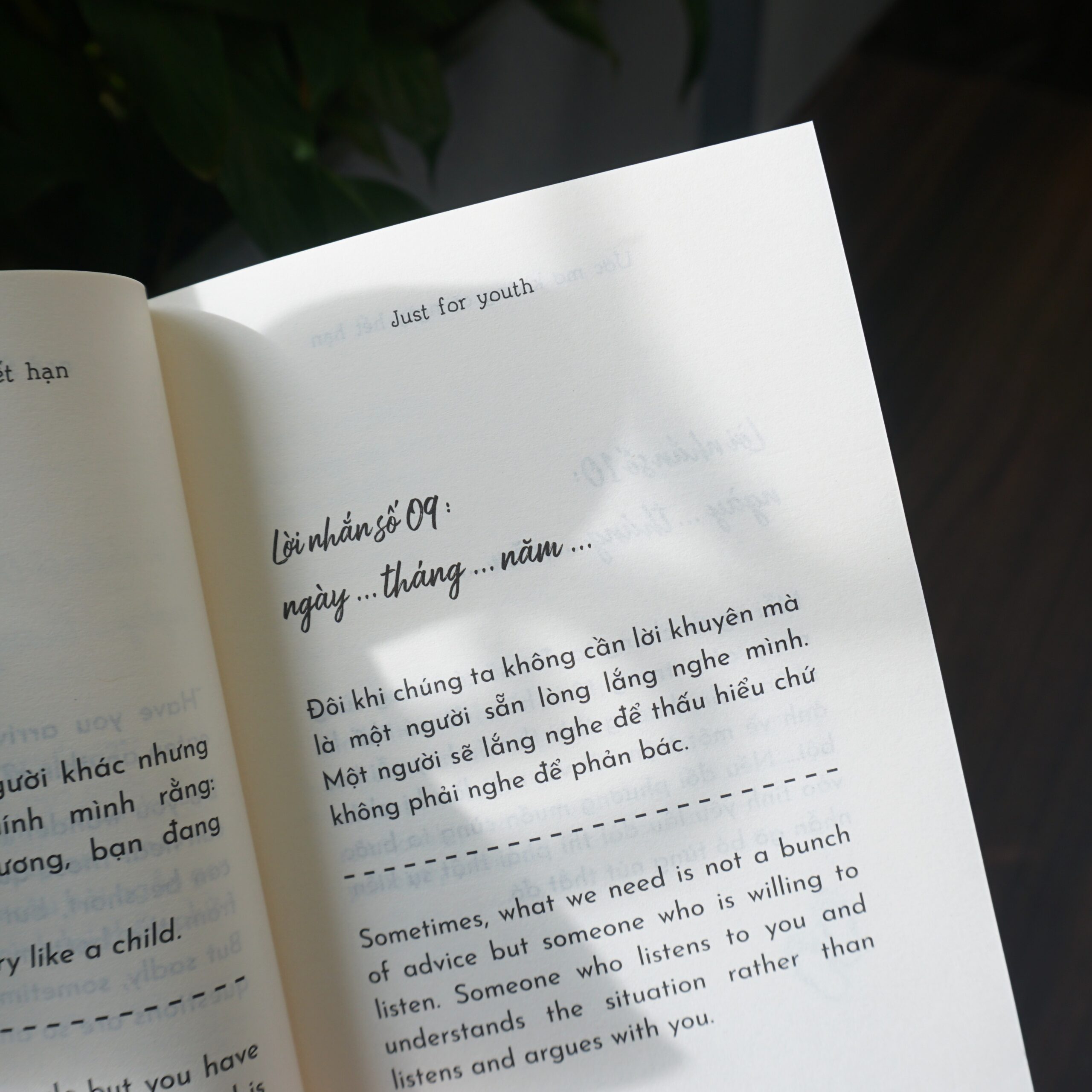 Trong Just For Youth, bạn sẽ bắt gặp những thông điệp đầy cảm xúc được truyền tải song ngữ Anh – Việt, cùng những câu chuyện chân thật từ trải nghiệm của tác giả. Mỗi trang sách đều khích lệ bạn kiên trì, nhắc rằng tuổi trẻ có thể hữu hạn nhưng ước mơ thì vô tận. Khi đối mặt với thử thách, bạn sẽ cảm nhận như mình không đơn độc, và từng dòng chữ như một lời nhắn nhẹ nhàng: “Tớ hiểu, cậu đã nỗ lực rất nhiều.”