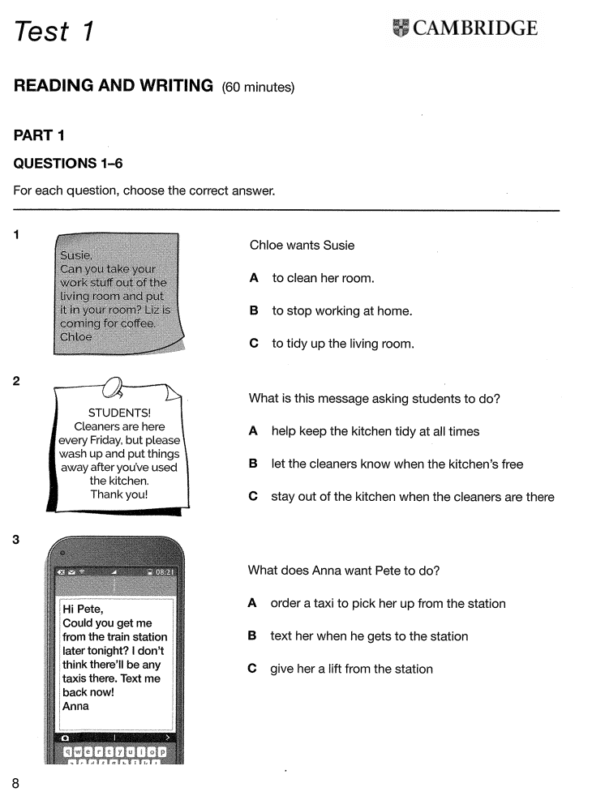 Mỗi đề thi trong A2 Key 1 PDF đều bao gồm nhiều dạng bài đọc – viết khác nhau.