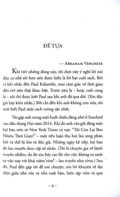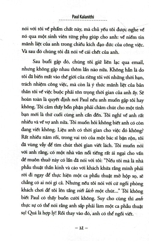 Văn phong của Kalanithi vừa lắng đọng, vừa sâu sắc, khiến độc giả cảm nhận rõ sự mong manh của kiếp người và giá trị của từng khoảnh khắc sống. Không chỉ là câu chuyện cá nhân, tác phẩm còn mở ra góc nhìn chân thực về nghề y, về sự đồng cảm giữa bác sĩ và bệnh nhân. Đây chắc chắn là cuốn sách chạm đến trái tim người đọc, khơi dậy nghị lực, niềm tin và những suy ngẫm sâu xa về ý nghĩa tồn tại của con người.