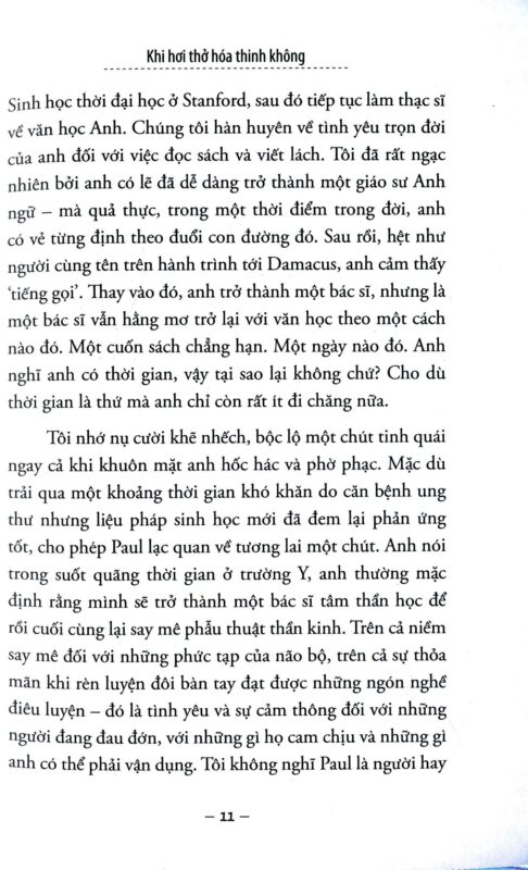 Đọc Khi Hơi Thở Hóa Thinh Không giống như cùng bước đi trên hành trình sống – chết với chính tác giả. Paul Kalanithi, một người vừa đam mê y học, vừa nuôi dưỡng tình yêu bất tận với văn chương, đã kể lại câu chuyện đời mình bằng ngôn ngữ giàu cảm xúc và sự chiêm nghiệm sâu xa. Tác giả đưa người đọc trở về những năm tháng sinh viên y khoa, khoảng thời gian khắc nghiệt trong thực tập, những đêm trắng ở phòng mổ, rồi bất ngờ xoay chuyển khi ông phải đối diện với chẩn đoán ung thư phổi ở tuổi 36.