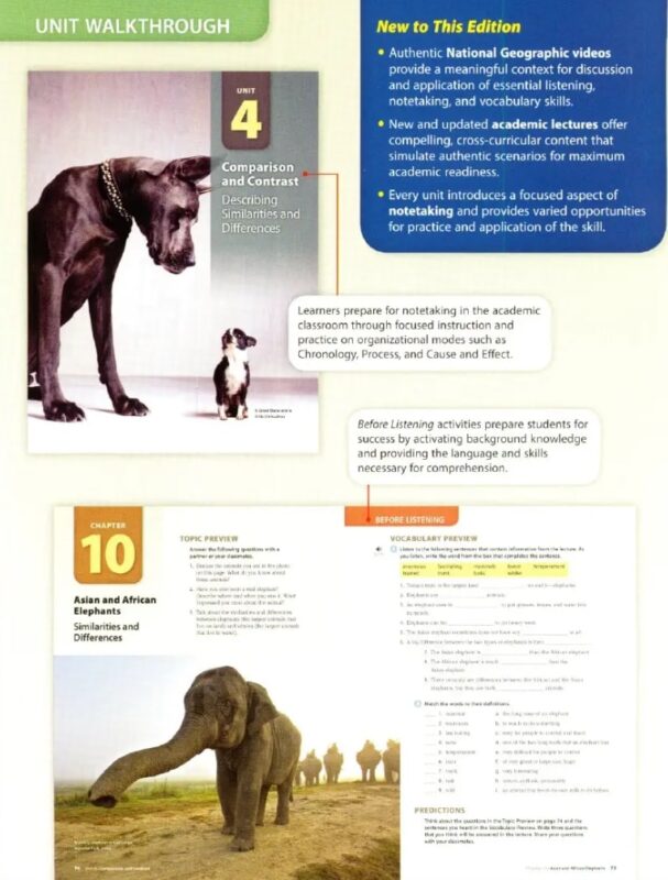Mỗi bài học đều có phần vocabulary preview, main ideas, details, và note-taking practice, mang lại trải nghiệm học tập toàn diện. Bên cạnh đó, sách còn đi kèm audio CD hoặc file nghe trực tuyến với giọng chuẩn Mỹ, hỗ trợ luyện phát âm và ngữ điệu tự nhiên.