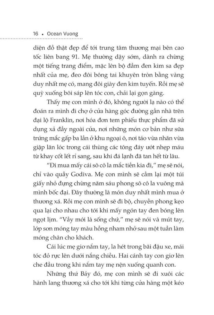 Nhà văn Celeste Ng cũng nhận định: “Ocean Vuong viết với sự chính xác của một nhà thơ, biến ký ức cá nhân thành ngôn từ có khả năng chữa lành những vết thương xuyên thế hệ.”