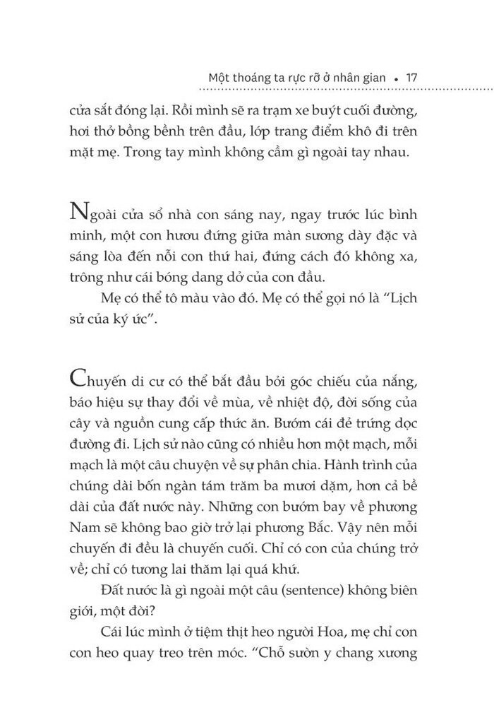 Một Thoáng Ta Rực Rỡ Ở Nhân Gian là cuốn tiểu thuyết giàu cảm xúc của nhà văn Ocean Vuong – một tác phẩm được viết dưới hình thức bức thư đầy day dứt mà nhân vật chính, Chó Con, gửi cho người mẹ mù chữ của mình. Trong những trang sách, độc giả sẽ bắt gặp ký ức tuổi thơ, hành trình trưởng thành, cùng nỗi đau và khát vọng tồn tại của Chó Con, xen lẫn câu chuyện về ba thế hệ gia đình di cư từ một làng quê Việt Nam sang nước Mỹ xa lạ.