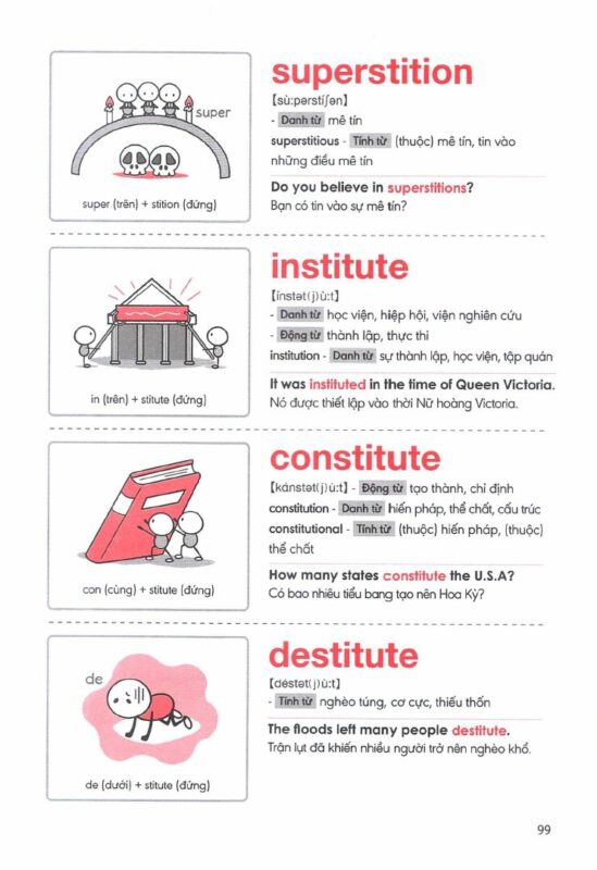 Cuốn sách Nghiền từ vựng tiếng Anh học qua gốc từ PDF trình bày hệ thống gốc từ phổ biến một cách logic, dễ tiếp cận. Mỗi nhóm từ được minh họa bằng hình ảnh sinh động, giúp não bộ ghi nhớ tự nhiên hơn so với việc học chữ thuần túy. Nhờ đó, người học không còn cảm giác khô khan khi tiếp xúc với từ vựng học thuật hay từ chuyên ngành.