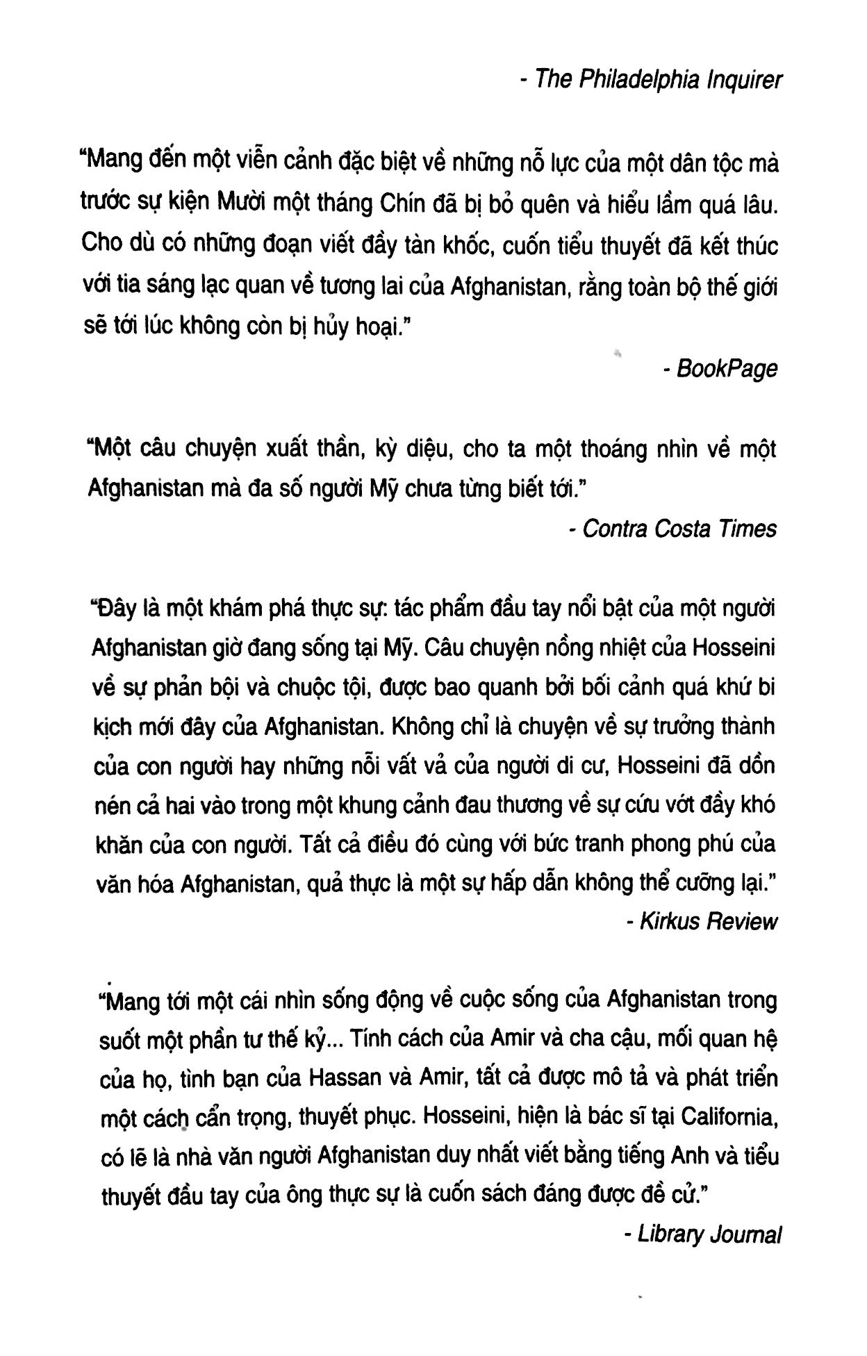 “Hosseini viết nên tác phẩm bằng cả sự dịu dàng lẫn nỗi kinh hoàng; vừa là giấc mơ California, vừa là ác mộng Kabul… Một câu chuyện cuốn hút và cũng là một ngụ ngôn sâu sắc.”