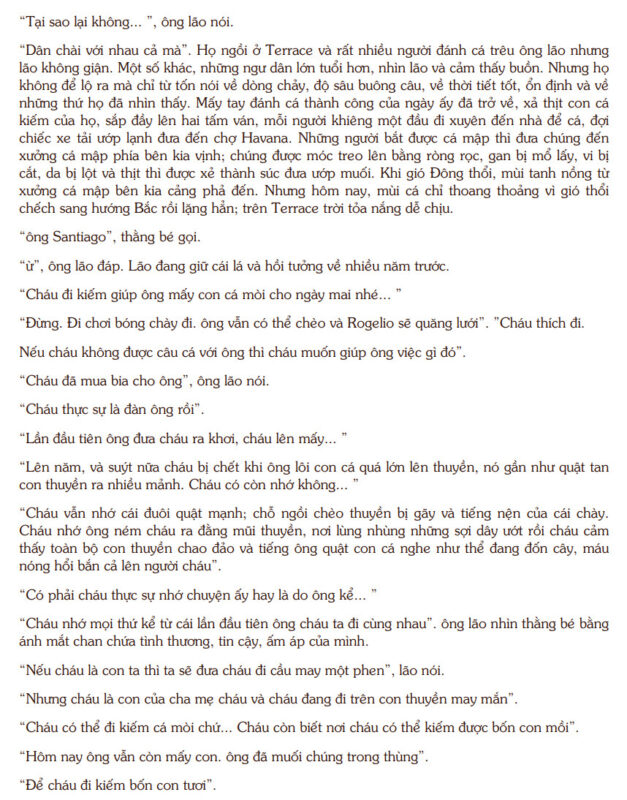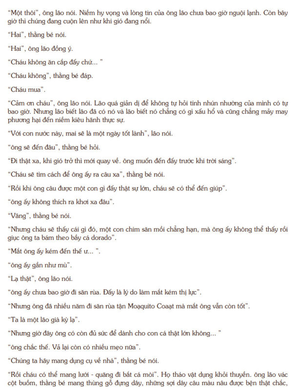 Ông Già Và Biển Cả kể về chuyến ra khơi cô độc của Santiago, một lão ngư già nhiều ngày liền không bắt được cá, nhưng vẫn kiên quyết đối mặt với đại dương. Cuộc chiến giữa ông và con cá kiếm khổng lồ không đơn thuần là hành động mưu sinh, mà là phép thử cho lòng can đảm và niềm tin vào giá trị bản thân. Trên mặt biển bao la, con người hiện ra nhỏ bé nhưng không hề yếu đuối, bởi ý chí đã nâng đỡ thể xác rã rời. Văn phong tiết chế đặc trưng của Hemingway khiến từng khoảnh khắc trở nên căng thẳng và giàu chiều sâu. Biển cả vừa là đối thủ khắc nghiệt, vừa là không gian để Santiago khẳng định phẩm giá. Tác phẩm để lại thông điệp bền bỉ về sức mạnh tinh thần và ý nghĩa của việc không chấp nhận đầu hàng.
