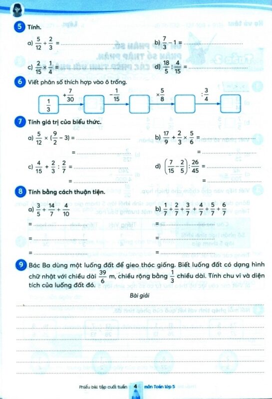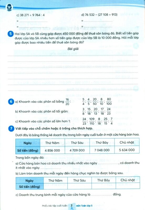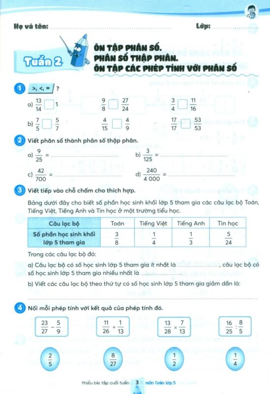 Tài liệu này không chỉ giúp học sinh tự ôn luyện ở nhà mà còn hỗ trợ phụ huynh, giáo viên trong việc đánh giá năng lực và theo dõi tiến bộ của học sinh. Với thiết kế khoa học, dễ hiểu, cùng lời giải chi tiết và hướng dẫn từng bước, phiếu bài tập Toán lớp 5 cuối tuần là công cụ học tập không thể thiếu để chuẩn bị tốt cho các bài kiểm tra, thi giữa kỳ và cuối kỳ.
