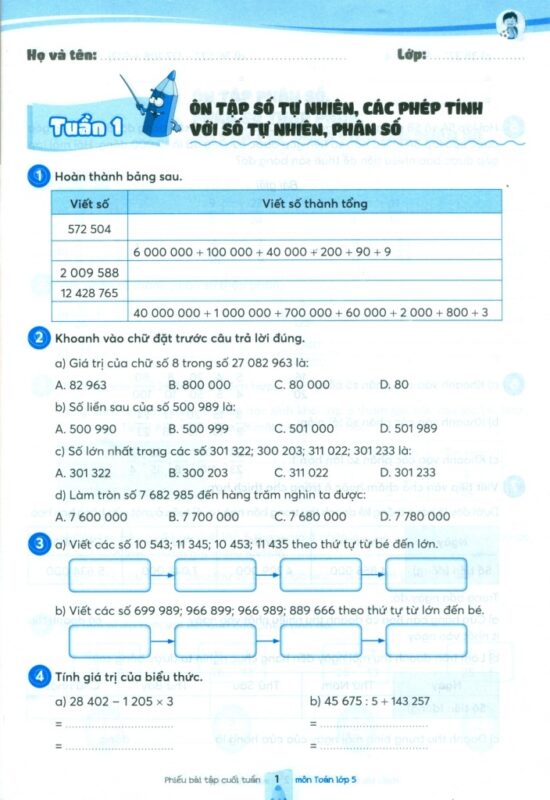 Học sinh sẽ được luyện tập với các số tự nhiên, số thập phân và các phép tính kết hợp. Phiếu bài tập không chỉ củng cố kiến thức mà còn hướng dẫn phương pháp giải bài toán thực tế, giúp học sinh làm bài hiệu quả và tự tin hơn. Nhờ đó, việc học trở nên khoa học và có hệ thống, không bị bỏ sót nội dung quan trọng.