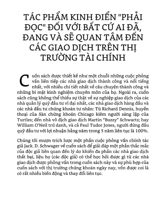 Điều làm nên giá trị đặc biệt của cuốn sách chính là cách nó phơi bày tư duy thực chiến: từ cách các “phù thủy” xây dựng hệ thống giao dịch cổ phiếu, quản lý rủi ro theo từng biến động nhỏ nhất, đến cách họ duy trì sự tỉnh táo trước những cơn hoảng loạn của đám đông.